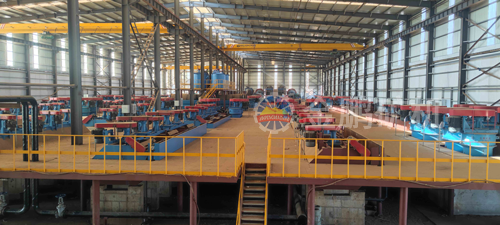 原礦經過三段一閉路破碎系統,采用一段閉路磨礦流程,磨礦細度為-100目占62%,經過一次粗選一次掃選,粗精礦濃縮脫水后再磨,磨后精礦進行三磨四選后進行濕式篩分,正目石墨經過一磨兩選后進入壓濾烘干系統,正目產品進行分目包裝,篩分負目經過一次濃縮浮選,再進行三磨四選,進入壓濾烘干包裝系統,尾礦濕排至尾礦庫。