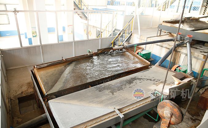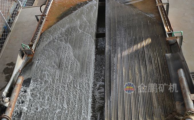 礦粒群從6s搖床床面上角的給礦槽送入,同時由給水槽供給橫向沖洗水,于是礦粒在重力,橫向流水沖力,床面作往復(fù)不對稱運動所產(chǎn)生的慣性和摩擦力的作用下,按比重和粒度分層,并沿床面作縱向運動和沿傾斜床面作橫向運動。比重和粒度不同的礦粒沿著各自的運動方向逐漸扇形流下,分別從搖床精礦端和尾礦側(cè)的不同區(qū)排出,最后被分成精礦,中礦和尾礦。