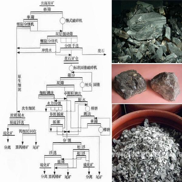 黑鎢礦多為石英大脈型或細脈型鎢礦床,嵌布粒度較粗,較易選別分離。對于黑鎢礦的選別,主要是以重選為主的聯合選礦工藝,分粗選、重選、精選和細泥處理4個階段。